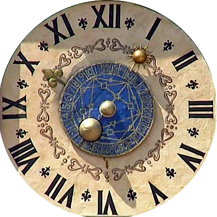 A 1552 public astronomical clock in Arezzo: once a 6-hour Italian time3 chapter ring1, now a frescoed 12-hour chapter featuring a subtractive IV.