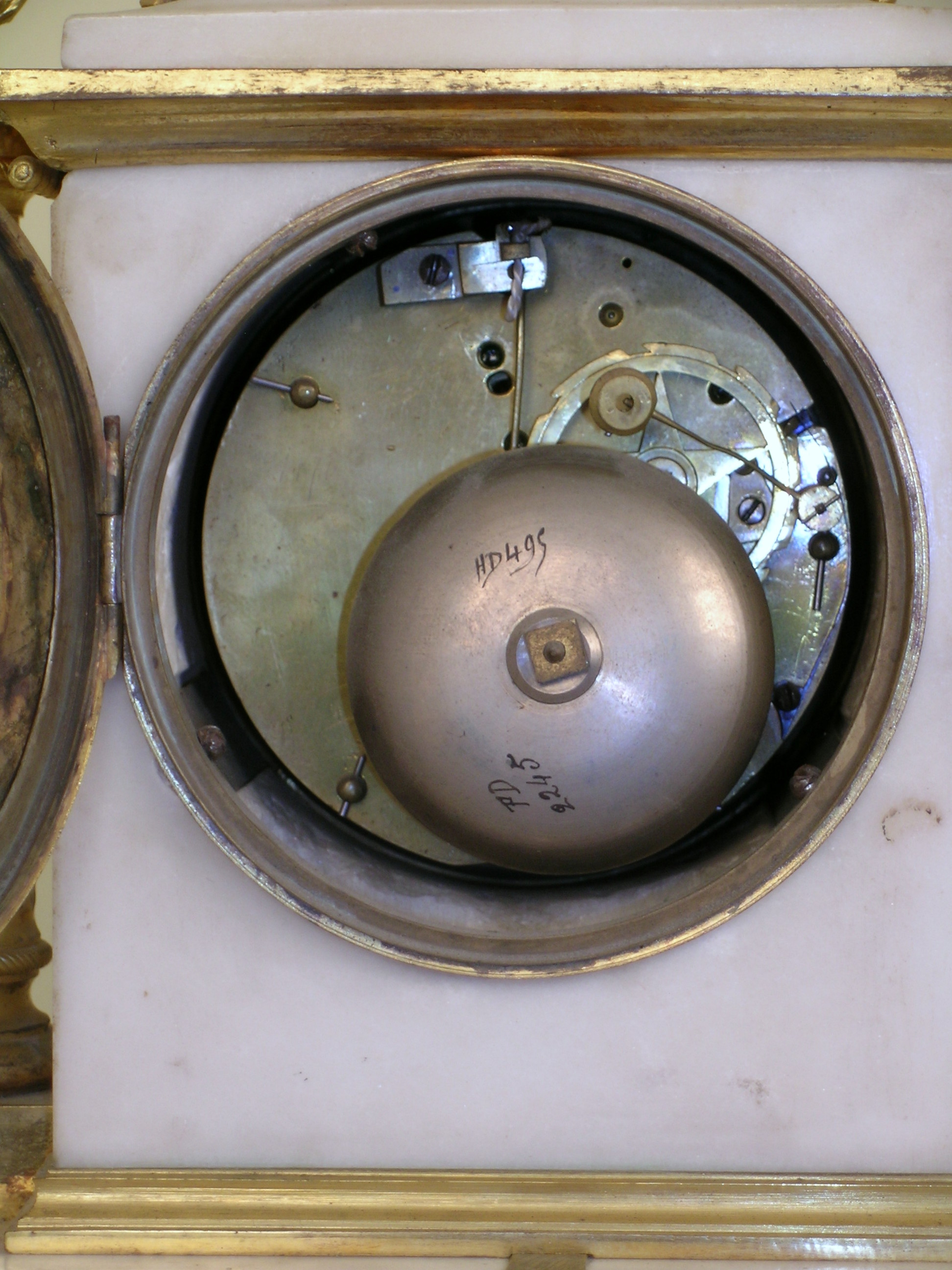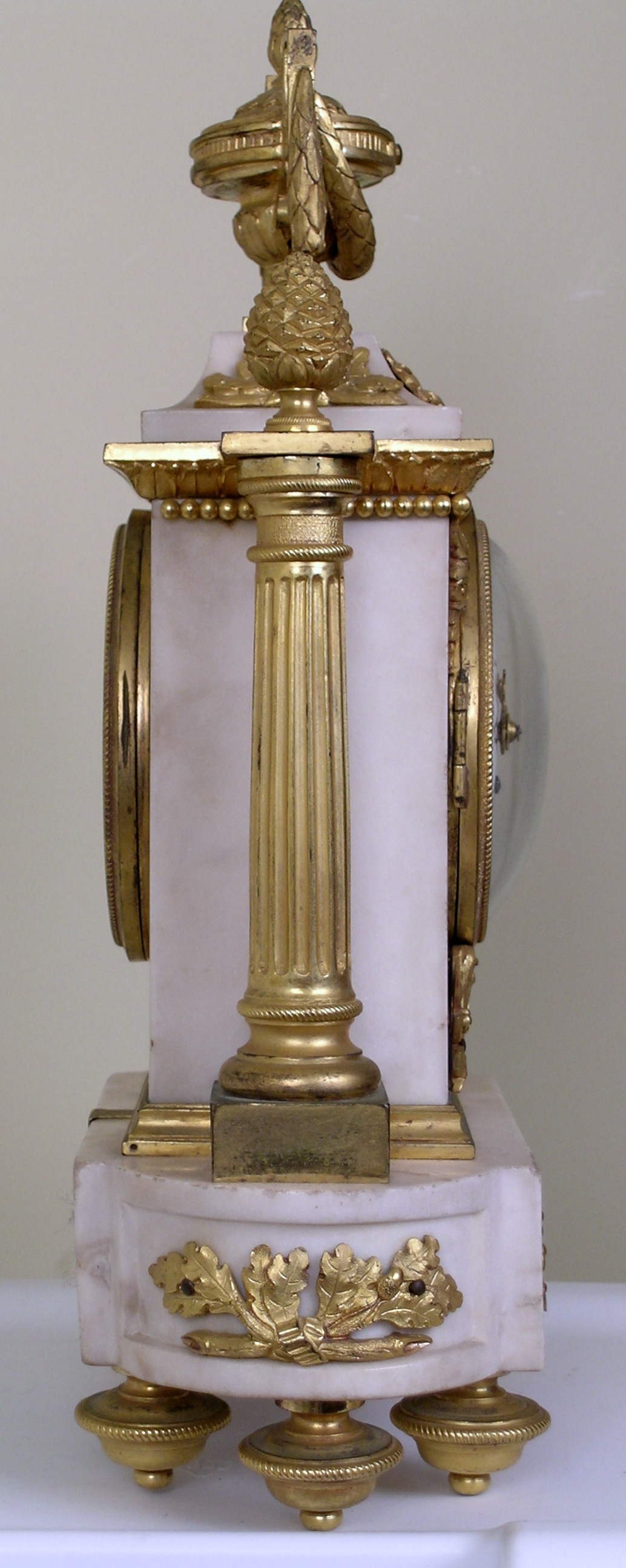 A lovely Louis XVI marble and ormolu pendule, signed on the original enamel dial Paliard A PARIS, c. 1780. The week-going movement has a going train with anchor escapement and silk-suspended pendulum, and a half-hour striking train governed by a countwheel and indicating the time on a bell. The clock is fully restored and comes with a two-year guarantee.