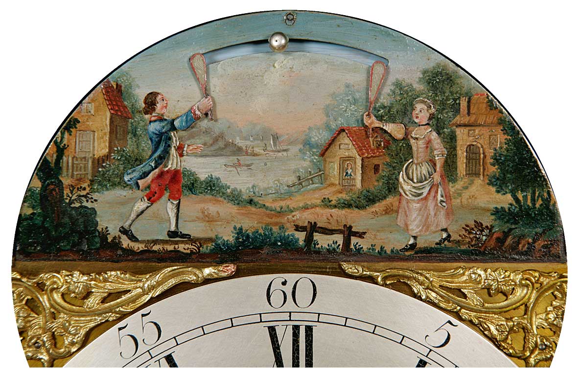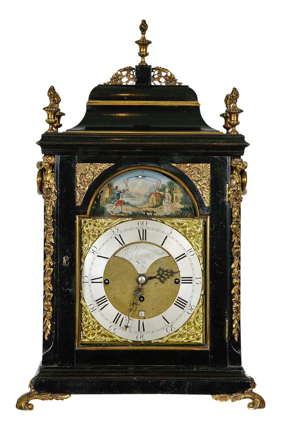 A George III period ebonised and brass mounted automaton table clock by Thomas Grinnard, London, c. 1770. The moulded ebonised case has a bell top, surmounted by a brass urn flambeau finial, flanked by pierced brass frets and, on the four corners, four further matching vase flambeau finials. The sides of the case have pierced wooden sound frets, brass carrying handles and on the corners elaborate caryatids, with cascading flowers and foliage. The clock is raised on gilded brass scrolling foliage feet. The arched brass dial has a silvered chapter ring around a matted centre, which shows three winding holes, a date aperture and a silvered signature cartouche signed Thos Grinnard High Holborn No 12. In the arch is a painted country scene depicting a couple playing tennis, with moving rackets and a mock pendulum masquerading as a tennis ball. The verge movement of eight-day duration has a finely engraved back-plate. The clock strikes the hours on a single bell and the quarters and half hours on a set of eight bells. • Height: 64 cm (25in). • The maker, Thomas Grinnard, was active in the second half of the eighteenth century. • Literature: B. Loomes, Watchmakers and Clockmakers of the World, London, 2006, p. 326.