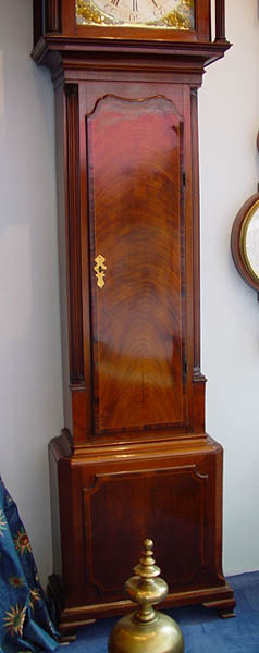 A fine longcase-clock. Signed:"Samuel Wright, Northwich". England c.a. 1780. A so called "Lancashire-type"longcase. Mechanisme: 8-days,going-and striking train, strikes on the whole hour. second-hand,date and moonphase. A silvered dial with gilt bronze spandrels on a brass plate A finely painted moon on the moon-disc, the silvered arch around the moon is engraved with the text:"Time and tide wait for no man". A beautiful mahogany case.Fine banding in the bottom-panel and door. Fluted 1/4 colums in the middel-section of the case, 1/1- and 1/2 fluted colums on the corners of the top. Very decorative etched- and gilt glass panels above the arch. Height: 2.44 m.