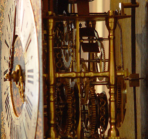 painted dial (reverse dated 1836) with foliate spandrels and waterscape in the arch, applied pewter chapter ring with Roman numerals signed Veltman Amsterdam for the retailer, brass hands and alarm disc, 30- hour weight driven brass posted movement with anchor escapement, countwheel half hour striking and alarm on a bell, well proportioned stained oak case with broken pediment lined with brass mouldings surmounted by three turned finials, freeze and sides with painted scenes behind glass panels, cannted corners with ebonised pilasters, pierced shaped brackets and tail with brass lenticle.