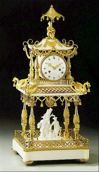 Pendule Pagode en bronze ciselé, doré et marbreblanc, ornée d'un groupe en biscuit de pâte dure de la manufacture de Locré du XVIIIeme Siècle.