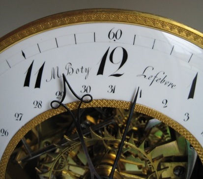A skeleton clock, by M. Boty Lefebvre à Liège, ca. 1800. Two pillar clock signed on the enameled dial which has an exposed center, M.Boty Lefrbvre à Liège. In the center sweep seconds, minute, hour and date hands. Note knife edge suspension to the pendulum, pinwheel escapement, quarter strike all signs of the fine quality of Lefebre’s workmanship. Clock is mounted on a black marble base. Style and quality similar to the skeleton clocks made by Hubert Sarton. Information Les Boty ( Bôty, Botty). Nicolas Boty was ‘maître horloger’ in 1770. One of his sons Mathieu-Joseph had a workshop in 1799. He was married in 1816 to Maria-Ida Lefèvre. In worked as clockmaker in association with his father in 1788. Later an association with Lefèbvre is apparent (Lefèbvre, à Chênee and J.J. Lefèbvre). Literature : ‘L’ âge d’or de l’horlogerie Liégeoise’. Ann Chevalier, André Thiry. Page 71. Een skelet klok van M. Boty Lefebvre à Liège, ca. 1800. Een twee pilaren klok met signering op de witte email wijzerplaat met een doorzichtig center M.Boty Lefrebvre à Liège. De centrale wijzer voor seconden, minuten, uren en datum. De mesophanging van de slinger, de pennegang, de kwartierslag zijn kenmerken van kwaliteit van de klokkenmaker Lefebre. Het uurwerk staat gemonteerd op een zwart marmeren sokkel. Stijl en kwaliteit van deze klok zijn identiek aan de klokken van de Luikse maker Hubert Sarton. Informatie Les Boty ( Bôty, Botty). Nicolas Boty was ‘maître horloger’ in 1770. Een van zijn zonen Mathieu-Joseph, had een uurwerk-atelier in 1799. Hij was getrouwd in 1816 met Maria-Ida Lefèvre. Mathieu Boty oefende in 1788 het beroep uit en was geassocieerd met zijn vader. Daarna blijkt een verband met Lefèbvre. Men neemt aan dat Lefèbvre, à Chênee en J.J. Lefèbvre ‘apparentés aux Boty’ waren. Literatuur: ‘L’ âge d’or de l’horlogerie Liégeoise’. Ann Chevalier, André Thiry. Pagina 71.