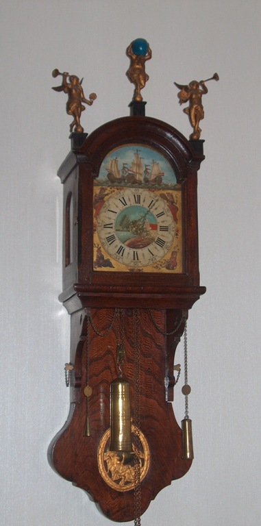 Superb Frisian Wall clock 'Spinnekopje' with rocking shipps automaton. One-day mechanisme,weight-driven, striking on half- and whole hour. Alarm. In a very fine oak case, elmwood tail, the hood crowned with "Fame" and "Atlas".