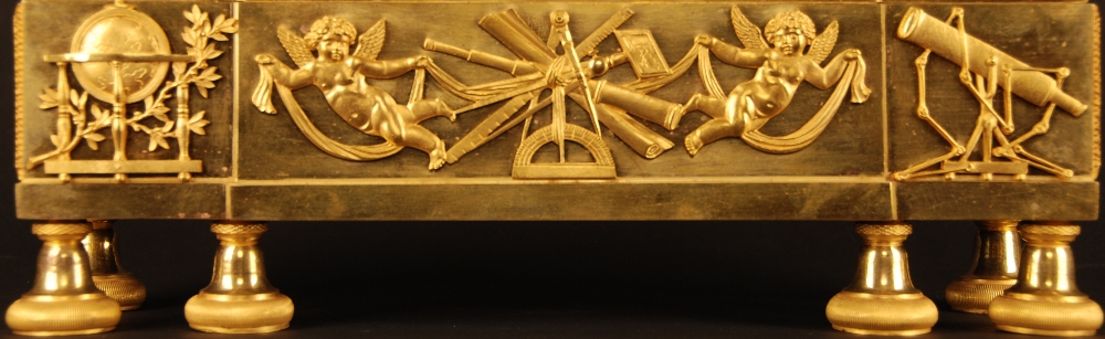 Beautiful Empire Mantel Timepiece ‘La leçon d’Astronomie’. The bronze case is fully gilt and decorated with bronze gilt ornaments depicting instruments of science. On top two seated lady's to a writingtable with draped tablecloth. The eight day movement with striking train placed in centre of the table. White enamel dial with black Roman numerals for the hours. France, circa 1800 Literature: A similar clock is printed on page 398 in the Encyclopédie de La Pendule Française, Pierre Kjelberg. Die Französische Bronzeuhr, Elke Niehüser, page 220.