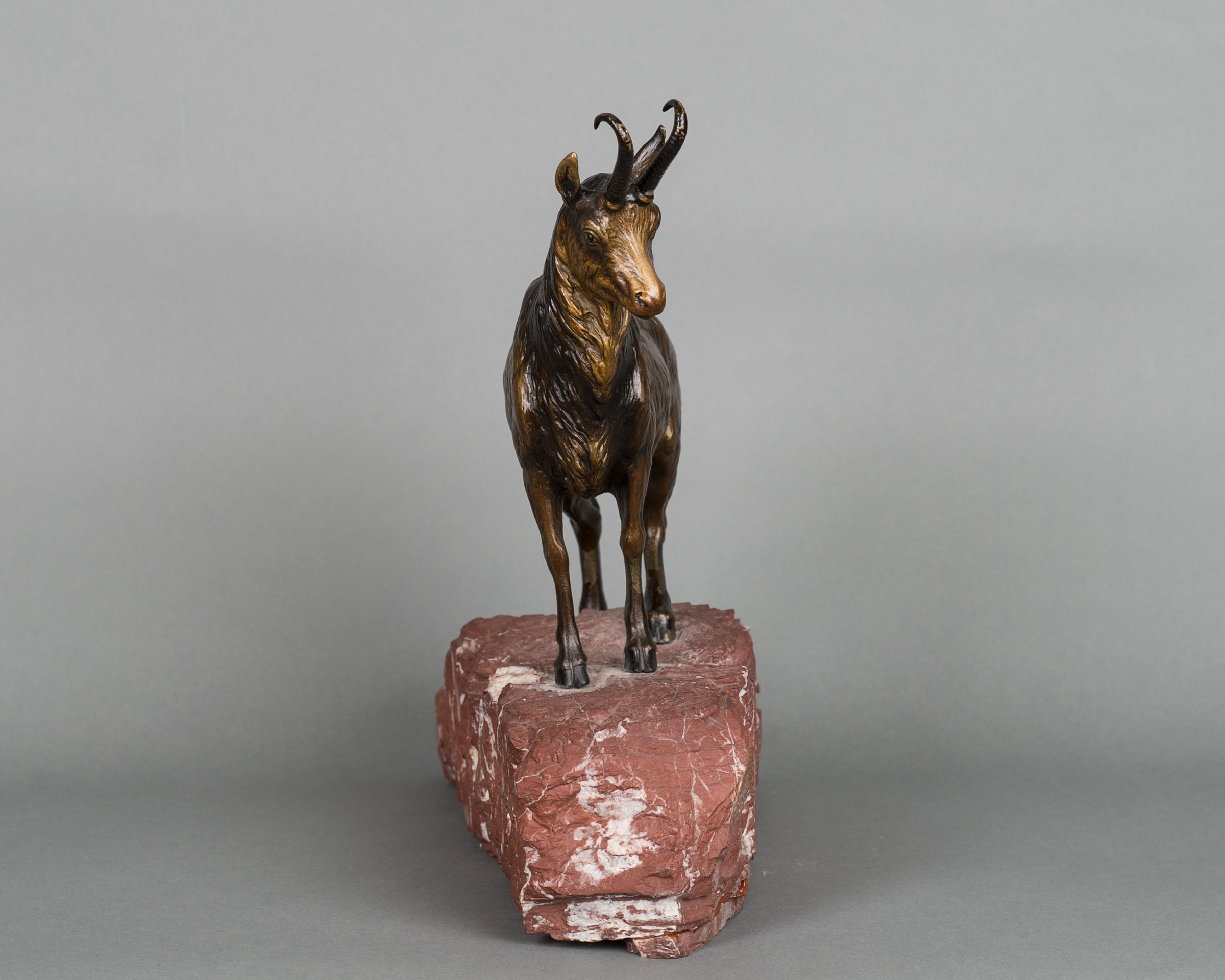 A very realistic, detailed multicolored Vienna bronze of mountain goat mounted on the red marble base with white stripes.