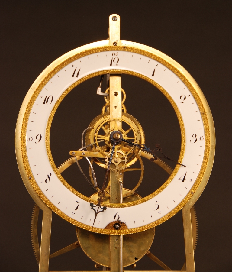 A striking keyhole framed skeleton clock with knife edge suspention, France ca 1820. Literature: ‘Continental and American Skeleton Clock’, Derek Roberts, pages 90 - 93.