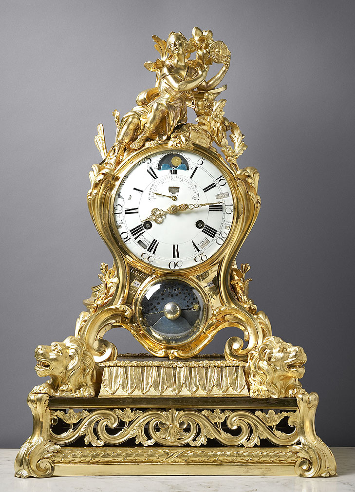 A very important Louis XV gilt bronze astronomical mantle clock of eight day duration, signed on the case below the white enamel dial Millot, with Roman and Arabic numerals and a fine pair of pierced gilt brass hands for the hours and minutes with a moon phase aperture above 12 o’clock and seven other calendar apertures within the dial. The magnificent scrolled-shaped case surmounted by Apollo as the Sun God seated amid flowers and foliage, leaning upon a pedestal wearing a tunic and sandals holding a radiating sun medallion with arrows beside his feet, with foliate scrolls around the dial terminated by scrolled feet upon a stiff leaf pedestal flanked either side by roaring lion heads and claw feet on a pierced foliate scrolling base with laurel leaf border and foliate scrolled feet Paris, date circa 1760 Height 75 cm, width 48 cm, depth 33 cm. Elke Niehüser, “Die Französische Bronzeuhr”, 1997, p. 200, pls. 63 and 64, illustrating two mantle clocks with similar surmounting figure but without the lion head base. The importance of Pierre Millot (b. circa 1719 d. after 1785) Horloger du Roi cannot be overstated. He was known for his mechanical brilliance, specialising in clocks with complications and astronomical movements, of which the present one is a fine example. Millot presented Louis XV with such a clock, and as a result the king, who pursued a passion for such mechanisms and was keen to reward a select few with outstanding talent, gave Millot an allowance and the coveted title Horloger Pensionnaire du Roi. Jean-Dominique Augarde, in “Les Ouvriers du Temps”, 1996, p. 250 notes that Millot was possibly the maker of two royal clocks described as “equation clocks, the one solar and the other lunar, decorated with chased bronze gilt in ormolu relating to the sun and moon, with attributes of Apollo and Diana…” These were set on superb pedestals by Gilles Joubert and placed in the King’s bedchamber at Versailles 31st May 1763. During the Revolution, 1792 they were transported to the Tuileries but nothing is known of their whereabouts since their acquisition by the ministère de l’Intérieur. A later inventory notes that the second clock (with case representing Diana’s attributes) was a planetary clock (according to the Ptolemy system). Given the similarity in the description of the first royal clock and the present example it is possible that they are one and the same. It is known that in 1764 Millot supplied a clock to the king for the grand salon at Château de La Muette (the royal hunting lodge in the Bois de Boulogne, favoured by Louis XV to house his mistresses). Two years earlier Millot presented two of his new clocks to the Académie des Sciences. Born at Converpuis near Joinville, by 1742 he was working in Paris as a compagnon and was then received as a maître-horloger on 1st August 1754 by a decree of 25th June that same year. Working from rue Saint-Dominique he enjoyed the patronage of many of the leading figures of his day, not least the King himself but also that of M. Dejean, the marquis de Beringhem, the duc d’Aumont as well as the duc and duchesse de Chevreuse, while today some of his works remain in important private collections and at Schloss Nymphenburg, Munich. He appears to have delighted in complicated movements and thus in addition to those with astronomical movements or equation he also made carillon clocks i.e. ones that played musical pieces on a series of bells at predetermined intervals. His success brought financial rewards to the extent that Millot was the owner of a country house at Issy where he went in the summer. He continued working until he retired to Sens in 1785. In 1754 Millot married Thérèse Emilie Lefebre by whom he had Jean-Pierre-Nicolas (maître-horloger 1785) and Thérèse-Emilie who married Nicolas Thomas (d. after 1806) Horloger du Roi. Millot used the finest cases, some of which were made by Robert and J B Ormond; he is also known to have collaborated with the great French Baroque sculptor René Michel (also known as Michel-Ange or Michelangelo) Slodtz (1705-64) for differing case designs. The present case is of exception quality and of an unusual design, portraying the Olympian deity Apollo who in later antiquity became associated with the sun god Helios (Sol). A number of Apollo’s attributes are portrayed here notably the sunburst medallion which he holds in his left hand while pointing to it with his right. Also included are Apollo’s arrows and laurel leaves as well as the lion heads, which relate to Leo the zodiac sign for the sun.