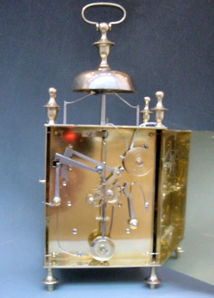 Messing kast in de typische sobere capucine vorm, zijdeuren, handel boven de bel. Witte wijzerplaat het Romeinse cijfers, wekkerwijzer. Klok met achtdaags uurwerk en slagwerk op een bel, repetitie. HxWxD ca. 28 (met handel hoog)/ 16,5 x12x 9 cm. € 8.500,-