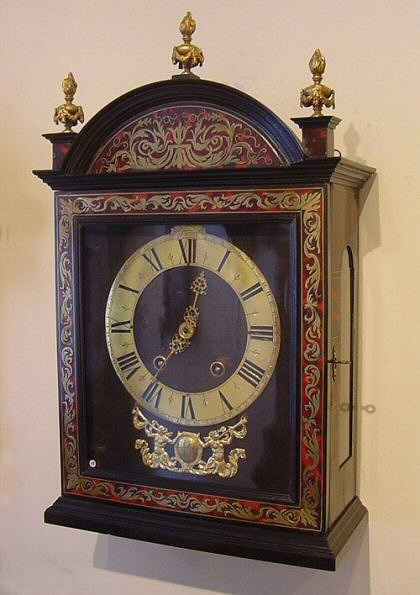 Nr. 100. Een religieuse klok, P.Le Maire, circa 1680. Messing uurwerk met spillegang en slagwerk op een bel. IJzeren wijzerplaat 29x25 cm bekleed met origineel bruin velours. Vergulde cijferring met Romeinse cijfer. Verguld en open gewerkte en gegraveerde wijzers. Gesigneerd op een schild met putti en op de achterplatine P. Le Maire A Paris.Geëboniseerde en me schildpad gefineerde kast. Voordeur en toog gedecoreerd met messing inlegwerk met krulpatronen. Glaspanelen aan beide zijkanten. HBD 47(+ vaas 53,5)x34x14 cm Prijs op aanvraag. Lit. H.M. Vehmeyer, Clocks volume II, page 800-807, page 980. Dr.R. Plomp ‘Spring-driven Dutch pendulum clocks 1657-1710’. P. 46 Tardy p. 371.