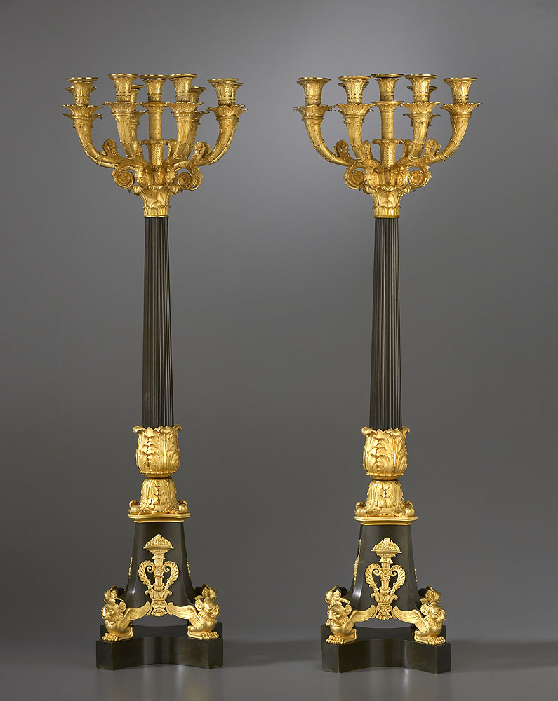 A large and imposing pair of Empire gilt and patinated bronze nine-light candelabra attributed to Pierre-Philippe Thomire, each with a central flared and foliate wrapped candle branch with a vase-shaped nozzle and circular drip-pan surrounded by eight further scrolled and conformingly shaped candle branches issuing from an acanthus ring heading the patinated fluted columnar stem terminated by gilt bronze acanthus leaves on a flared four sided plinth mounted at each corner by winged lions on a concave-sided base with canted corners Paris, date 1810-15 Height 110 cm. each. Literature: Olivier Lefeuel, “Percier et Fontaine” in “Connaissance des Arts”, Paris, 15th June 1954, no. 28, p. 35, illustrating a page from a set of designs by Charles Percier and Pierre François Léonard Fontaine for the Russian Tsar of work in the Louvre and Tuileries, showing a woman’s bedroom with a torchère, which as here has a similar fluted columnar stem with seemingly similar mounts and supported on a very similar base decorated with very similar mounts. Hans Ottomeyer and Peter Pröschel, “Vergoldete Bronzen”, 1986, p. 393, pl. 5.17.11, illustrating a very similar candelabrum but with a differing and far simpler base by Pierre-Philippe Thomire and signed Thomire Paris of circa 1815. Pierre Arizzoli-Clémentel, “The Percier and Biennais Albums in the Musée des Arts Décoratifs, Paris”, in the “Burlington Magazine”, March 1998, p. 197, pl. 55, illustrating a design for a related candelabrum by Charles Percier for the Empress Josèphine in the Musée des Arts Décoratifs, Paris. Not only is this magnificent pair of candelabra of great quality and unusually large size but they can be attributed to the preeminent fondeur-ciseleur Pierre-Philippe Thomire (1751-1843), whose production included a number of similar candelabra which he often supplied to the Imperial palaces. Variants of the model can be found in the Hôtel Beauharnais, Paris and in Archangelskoje Palace, Leningrad. Furthermore they were almost certainly made after or at least inspired by a design by Napoleon’s chief architect Charles Percier (1764-1838). The attribution to Percier stems from the drawings cited under literature. The design in the Musée des Arts Décoratifs (which featured as plate 59 in the 1827 edition of Percier and Fontaine’s “Recueil de Décorations Intérieures”) is altogether far more elaborate in that the flared candle branches are supported on winged deer and though the stem is of a more ornate design the foliate terminals at its base are not dissimilar. As here the four sided plinth is slightly flared and has similarly shaped winged lions at each corner. Interestingly Percier’s design for the plinth was directly inspired by an altar from the Borghese collections now in the Musée du Louvre. The winged lions, which are of an unusual and idiosyncratic design are virtually identical, except for the alignment of the wings, to those appearing on a clock case by Claude Galle (1759-1815) of circa 1805 (illustrated in Ottomeyer and Pröschel, ibid, p. 372, pl. 5.14.2). Interestingly the latter clock compares very closely to a gilt bronze and marble case of the same date with mounts by Thomire et Cie although the monopodia lions there are of slightly differing form (illustrated in Pierre Kjellberg, “Encyclopédie de la Pendule Française du Moyen Age au XXe Siècle”, 1997, p. 368, pl. C).