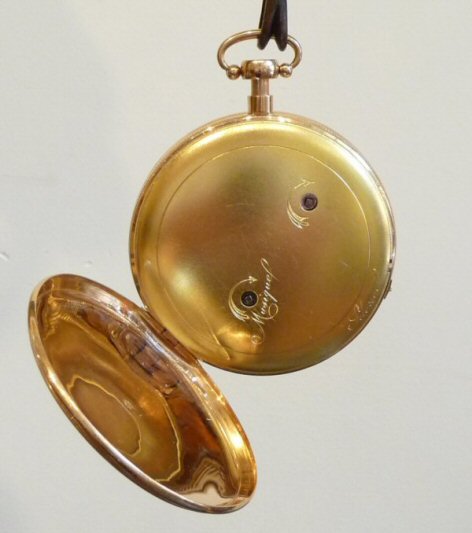 Nr. 70. A musical pocket watch, Piquet circa 1820. White enamelled dial Ø ca 5,5 cm with Roman numerals. 18 K gold guilloché case. Musical work ‘sur plateau’ plays every hour – one tune - and on request (return to begin position handle). Quarter-repeating on request. A one day movement. This watch dates from C.1820 and was probably made by the firm of Piguet who specialized in musical watches and were more or less the only people producing musical work at this time. Piguet also had connections with Henri Capt and Samuel Meylan who supplied retailers such as Bautte et Moynier in Geneva with complex objects which often incorporated musical work. € 14.750,-- Nr. 70. Een zakhorloge met speelwerk, Piguet, circa 1820. Witte email wijzerplaat met Romeinse cijfers, Ø ca 5,5 cm. Kast verguld 18 karaat, guilloché gegraveerde achterkant Het zakhorloge heeft een speelwerk ‘sur plateau’, speelt elk uur – één melodie - en op aanvraag. (schakelaar terugzetten!). Kwartieren slagwerk op aanvraag. Looptijd 1 dag. Dit zakhorloge is te dateren circa 1820 en wordt toegeschreven aan Piguet, die gespecialiseerd was in speelwerk-zakhorloges. Piguet was zowat de enige die horloges met speelwerk maakte. Piguet had relaties met Henri Capt en Samuel Meylan, die toeleveringbedrijven waren voor de detailhandel zoals Bautte en Moynier in Geneva en hen voorzag van complexe uurwerken vaak voorzien van een speelwerk. € 14.750,--