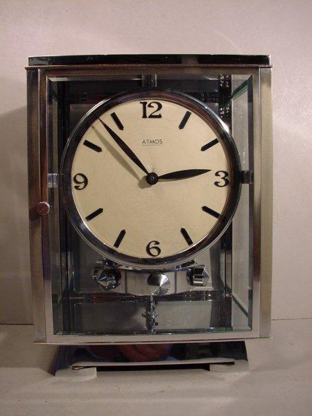 An early 1932 Rhodium plated art deco J. L. Reutter four-glass clock, the substantial Rhodium plated four-glass case in an Art-Deco style containing a signed champagne coloured dial with Arabic numerals and black dagger hands, the dial signed Atmos, Pendule Perpetuelle. Made In France, the movement numbered 1212, the condition of this clock is amazingly good and very original 9 ½” x 7 “ x 5½ “