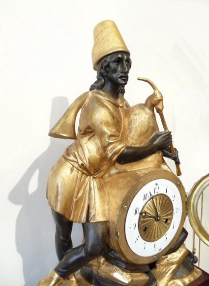Een Biedermeier gepatineerd en verguld houtgesneden sculptuur, pendule met slagwerk en Augenwender mechaniek, begin 19de eeuw. Arabische man speelt doedelzak en leunt naast de klok in een rotsimitatie. Wijzerplaat met email cijferring met Arabische nummers en verguld midden. Ankergang met slagwerk op een bel, slinger, twee daags uurwerk. HxBxD 46x32x14.