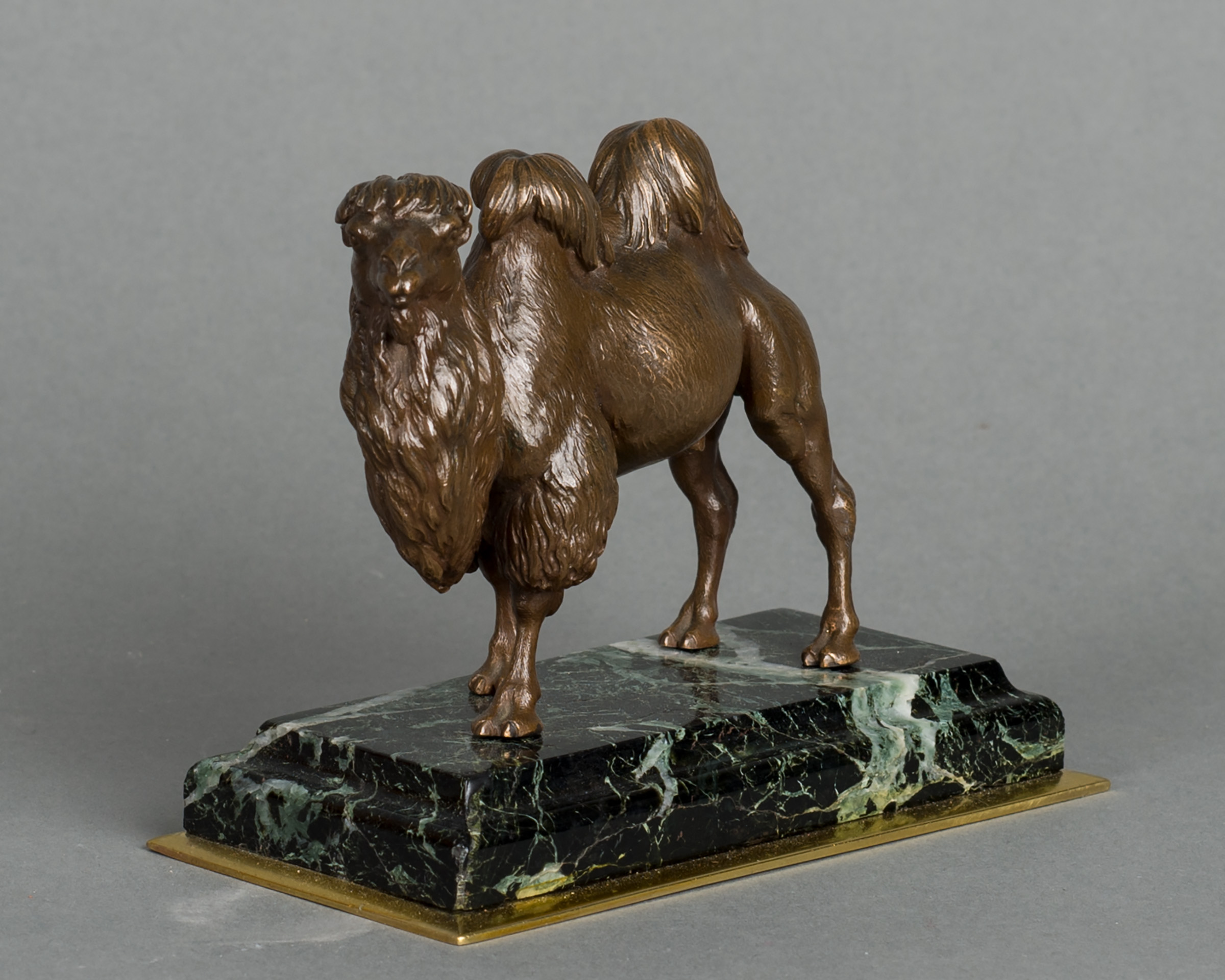 An unusual, lovely patinated camel bronze mounted on the green marble base with bronze plinth.