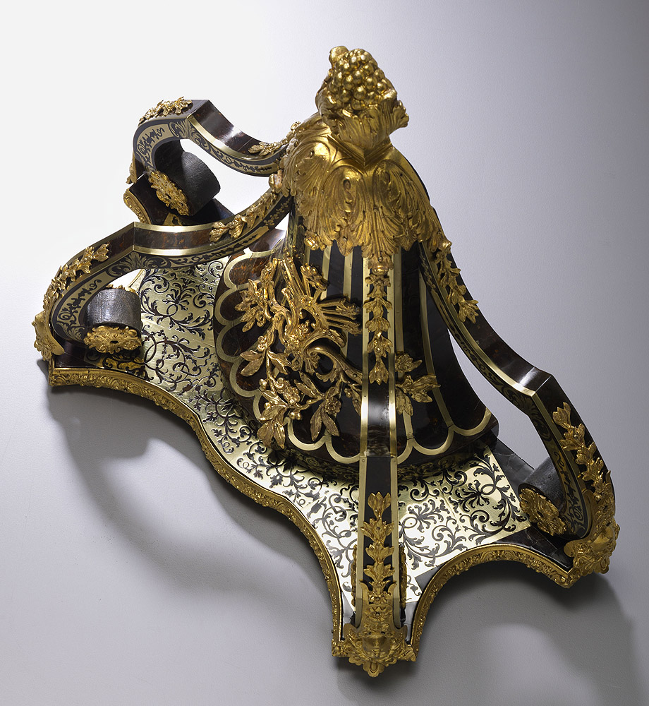 An almost identical clock was owned by the comte de Beaumont and like this reflects the taste for luxury and ostentation that prevailed during the reign of the Sun King, Louis XIV. The art of brass and tortoiseshell inlay was perfected by André-Charles Boulle (1642-1732), from whom the technique gained its name. It involved a gift for artistic invention as well as great skills in cutting out with a fretsaw the brass and tortoiseshell sheets (laid one on top of one another) to ensure that the cut-out pieces of brass then perfectly fitted into the spaces left in the tortoiseshell and vice versa. Much of Boulle’s pieces were made in pairs, the areas with brass-in-tortoiseshell being known as première-partie and the negative known as contre-partie (as for instance on the interior of the backdoor). Boulle created a variety of furniture and clock cases decorated with such refined marquetry, which soon became the height fashion. An example of a similar Boulle clock can be seen in Watteau’s famous oil “L’Enseigne de Gersaint” of 1721 (Charlottenburg Palace, Berlin).