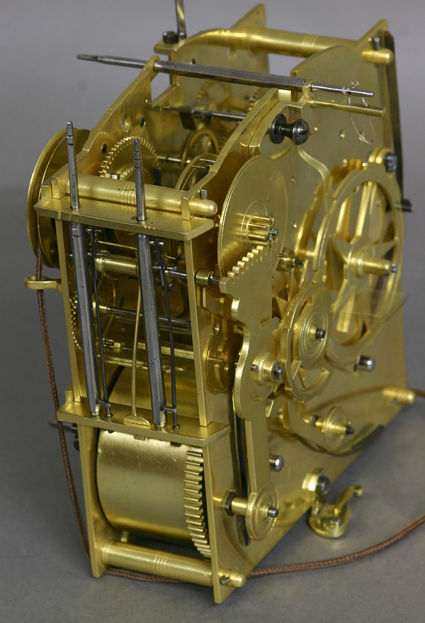 Rare Ormolu Quarter-Repeating 'Pendule d'Officier', France ca 1762. Maker: LeFebure a Fontainebleau. Case: The rectangular glazed ormolu case has numerous decorative appliques including a palmette border, five decorative finials, five-pointed stars to the sides and a reeded cupola with a hinged handle above. Dial: The white porcelain dial has black Roman numerals for the hours, black Arabic numbers for the five-minute marks, cast ormolu hands, is signed by the maker, 'LE FEBURE A FONTAINEBLEAU' and is indistinctly signed on the back by the enameler. Movement: The eight-day spring driven movement has turned pillars, an anchor escapement, a silk-suspension, a silk thread pendulum with a decorative lock and carries the spring loaded repeat work on the back-plate. Located under the handle are two bells and three hammers. While running, the single hammer strikes the hours and half-hours by torsion on the larger bell. When manually activated by pull cord the two other hammers count the quarters on both bells and then the single hammer counts off the hours. Notes: Jean Lefebvre was admitted master in 1733 and became clockmaker to the King working in Paris and Fontainebleau. The springs are signed 'Novembre, 1762'. Size: 12 inch high.