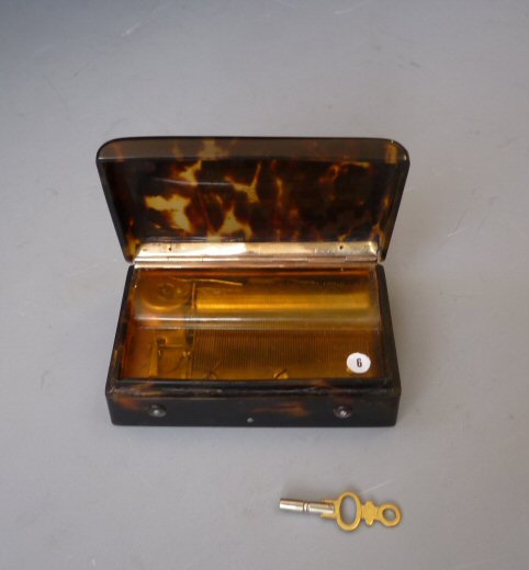 Nr. 6. A tortoiseshell music box made by Le Coultre, 2 airs, ca. 1840. Impeccable box with translucent lid and cylinder music work playing two melodies, made and signed by Le Coultre on the comb. Small snuffbox with musical surprise and qualities by one of the best makers. Choose another melody when the music is not playing (cylinder in rest). HxWxD 3x9x5,5 cm.